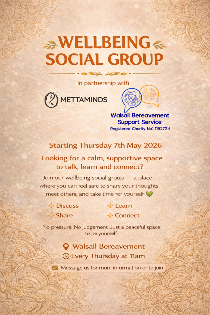 WBSS provides confidential one to one support for bereaved adults at various locations around Walsall Borough. Here you can talk about the impacts of your bereavement that you may not feel able to talk about with anyone else.